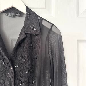 Size small petites from INC. Black mesh long sleeve button down collared top . Has black lace trim along sleeve cuffs and front chest with sequin and beads accents. Whimsygoth goth witchy core. Preowned in good condition with no stains or tears.