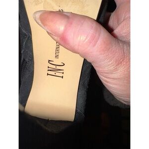 These INC women's boots are a size 5.5M and feature a lace-up style in black suede. Designed for casual occasions, they have a chunky heel and are made in China. The boots are pre-owned but in excellent condition. Keywords: INC, women's boots, size 5.5M, lace-up, black suede, chunky heel, casual, pre-owned, excellent condition, China.