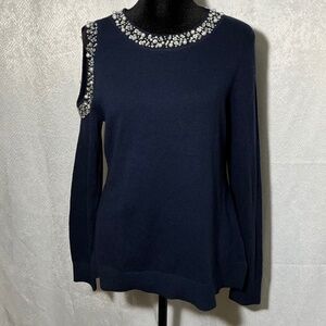 INC Women’s Embellished Cold Shoulder Sweater Navy Beaded Neckline Size S NWT