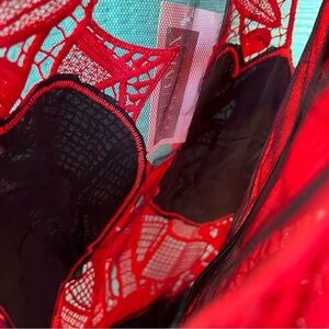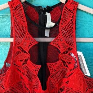 STUNNING Designer Jonathan Simkhai Red and black lace crochet Tulle and Lace Peplum Top.