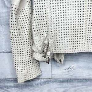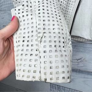 IRO ‘Caelie’ perforated leather biker jacket. The chest measurement is 16.5” across laying flat and the length is 22” from shoulder to hem. Size 1 or small. There are 2 small tears in the leather (see last 2 photos).