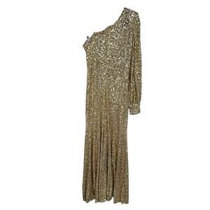 Ieena for Mac Duggal Gold Sequined One Shoulder Bishop Sleeve Trumpet Gown 8