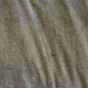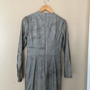 Silver spandex (100% Polyester). A-line. V-neck. Long sleeves. Back zipper closure. See size and fit notes for length measurements. 15” side slit.