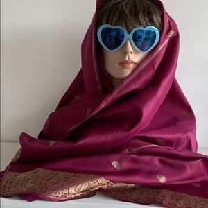Stunning deep purple hand woven silk shawl with gold paisley design and gold borders. Mint condition.