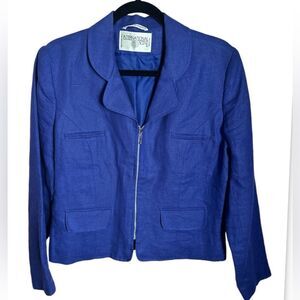 International Scene blue zip blazer is a polished and versatile piece, perfect for elevating both professional and casual looks. Featuring a sleek front zipper closure, this blazer combines modern functionality with timeless style. The fully lined interior ensures a comfortable and smooth fit, while the rich blue color adds a sophisticated touch to your outfit. With its structured design and tailored silhouette, this blazer is ideal for layering over blouses or dresses, making it a go-to piece for both work and social occasions.Size 9/10