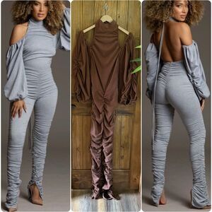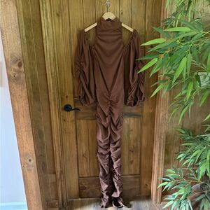 The 09 Jumpsuit by Irregular Exposure in Brown. Pull on style. Open shoulders. High neck with ties at back. Low scoop open back. Slits at hem. Ruching for a flattering fit. Gently worn with no flaws. Measurements in photos (note- mesurements are laying flat, and there is a lot of stretch to the material). Stock photos to show fit.