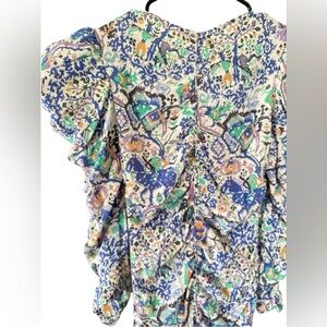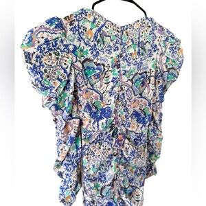 Floral and paisley print covers this minidress, shaped with allover ruching and framed by bold `80s-inspired puff sleeves.