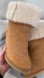 Stylish camel boots with cozy shearling trim. Perfect for winter wear.