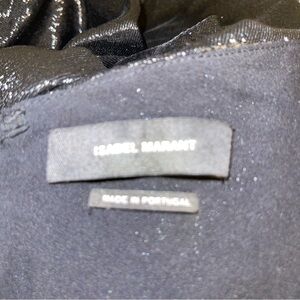 From Isabel Marant's Spring 2015 collection, a black lamé Linn ruched cocktail dress styled at single shoulder with pleated ruffles.