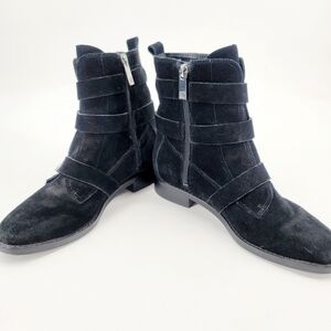 Booties are black leather upper with felt swede material. Inner sipper and straps buckle design.