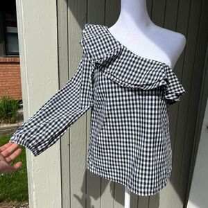 Great top, in excellent condition J Crew navy blue and white gingham one-shoulder top. Ruffle detail, left side zip closure. Perfect to dress up or down.