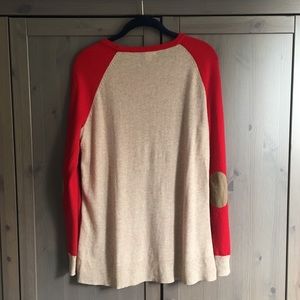 Red/Tan Side button sweater in colorblock from J. Crew. Features elbow patches, long sleeves, crew neck, contrasting cuff and back panel, functional side buttons, slight high/low relaxed fit, 12-gauge knit, and vicrose/wool/rabbit hair/nylon blend. Excellent condition.
