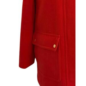 Stay warm in style with this classic J.Crew Vail Parka in a vibrant cherry red. Crafted from a cozy wool blend, this coat features a hood with plush faux fur trim for a touch of winter luxury. Front flap pockets add both style and functionality, while the tailored silhouette keeps it sleek and flattering. Perfect for crisp winter days, holiday outings, and city strolls.