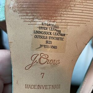 J. Crew Seafoam Green Suede Leather Strappy Heeled Sandals size 7. Very good preowned condition. Small discoloration on front of one see pictures. Buckle ankle strap. Straps cross over foot. Really pretty color. Very soft leather. Minor wear to soles and heels. Newer style from 2021.