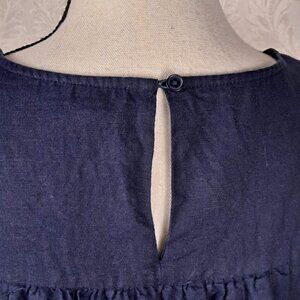 Sleeveless cotton/linen blend dress is lightweight and will help you keep cool. In a navy blue with green embroidery around the neckline and hem. Keyhole back with button closure. Fully lined. POCKETS!