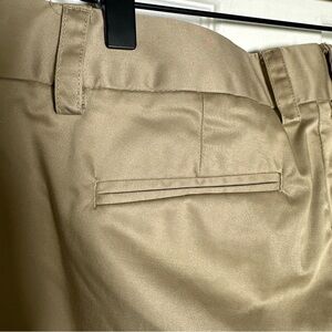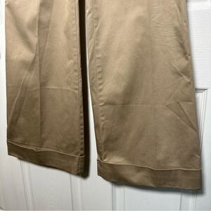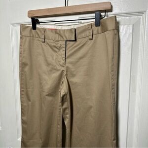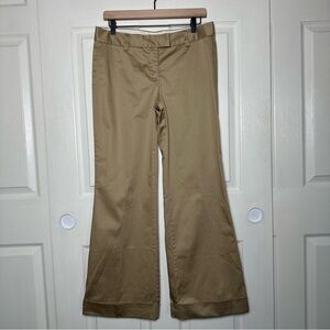 These J Crew women's khaki wide flare leg City Fit pants in size 6 short are a versatile and stylish addition to any wardrobe. Made from a comfortable blend of spandex and cotton twill fabric, these dress pants feature a mid-rise waist and a classic fit. The cuffed hem adds a modern touch to the solid beige color, making them suitable for casual, formal, or business occasions. With a zipper and hook & eye closure, pockets, and a wide-leg style, these pants offer both comfort and style for the modern professional woman. Perfect for all seasons, these pants are machine washable and easy to care for. Workwear, office wear