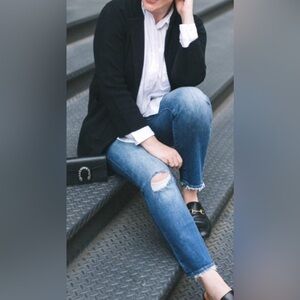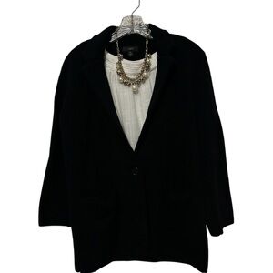EUC FLAWLESS The fabric of the sweater blazer is a lighter-weight cotton/poly/wool blend you can wear all year long which makes this a great investment pieces. It’s the perfect polished-but-relaxed style that makes it versatile and I also love that it is made from responsibly grown cotton via the Better Cotton Initiative Stylish black blazer jacket. Perfect for casual or formal wear.