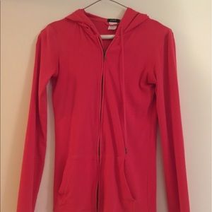 Super light bright red zip up hoodie with front pockets. Two tiny marks as pictured on front right. Otherwise no signs of wear. Slightly heathered-style red