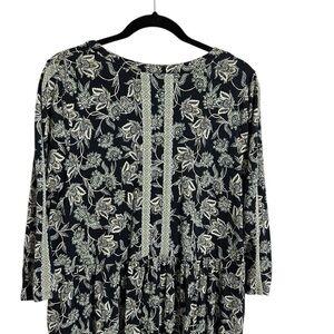 Size: M Bust: 20" Waist: 20" Hip: 26" Length: 38" Features: Navy Blue, Floral Print, Light Weight, Oversized, Stretchy, Casual, Classic, Lagenlook, Boho, Flowy, Fun, Church, Brunch, Daytime, Side Pockets, 3/4 Sleeve, Split Neck, Midi Length, Knit,