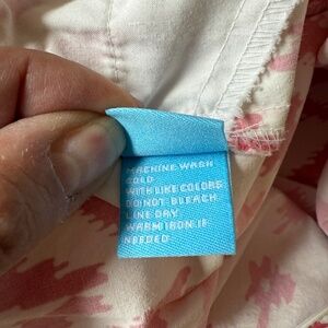 Size 2, pink and white Ikat geometric pattern, zip fly, single button closure, belt loops, side pockets, hits above the knee, cotton blend.