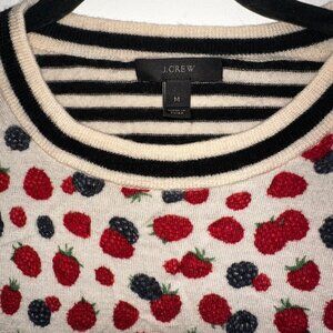 So cute and fun! This J.Crew short-sleeve sweater features an adorable allover berry print with red strawberries and dark berries on a cream background. Ribbed neckline, sleeves, and hem with contrasting black and white stripes add a classic touch. Perfect for layering or wearing on its own for a playful, vintage-inspired look.