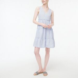 J. Crew Blue Striped Cotton Seersucker Ruffle Mini Dress. This sleeveless summer dress features a v-neck, side zipper, 2 on seam pockets, and a ruffle tiered skirt. 109% cotton. Size 8.