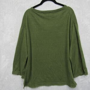 J.Crew Linen Sweater Top Round Neck Green 3/4 Sleeve Pullover XL Crochet Border