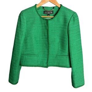 J.Crew Louisa Lady Jacket in Sequin Tweed Summer Green. Size 4. Features collarless, long sleeves, concealed front gold-tone button closure, side welt pockets, cropped length, and sequin tweed fabric. Style BR725. 54% Cotton, 32% Polyester, 12% Acrylic, 2% Other Fibers. NWT / New with tags.
