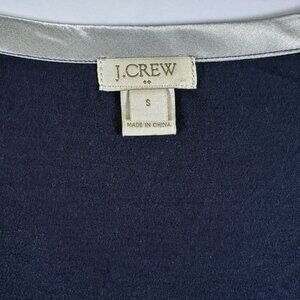 This J.Crew navy blue short-sleeve scoop neck t-shirt features a silky ivory contrast trim at the neckline, adding a touch of elegance to a classic silhouette. Designed for comfort and versatility, this lightweight tee is perfect for layering or wearing on its own across all seasons.