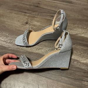 JEWEL BADGLEY MISCHKA Peggy Wedge Silver Glitter 10 NWOB