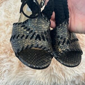 JIMMY CHOO | Black & Gold Snake Skin Print Suede Peep Toe Lace Up Heels | 39.5 9