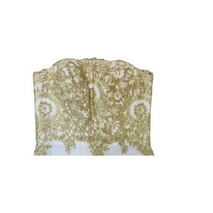 This is a knee-length A-line homecoming dress from JJ's House in size US 8/EU 38. The dress is strapless and made of chiffon fabric, with a lined interior. It is designed for women and falls under the brand "House."