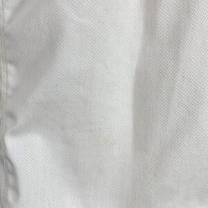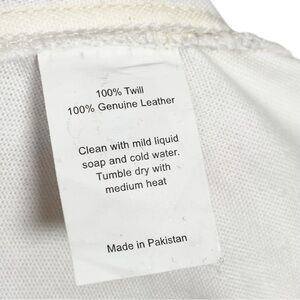 Features: woven cotton twill style fabric. Leather trim. This jacket is meant to have a burnished distressed/discolored look. Collared. Puff shoulder detail. Long sleeves. Button front closure.