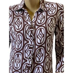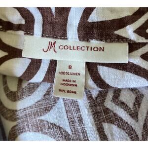 JM COLLECTION Womens Size 8 Brown White Linen 3/4 Sleeve Button Up Collar Shirt
