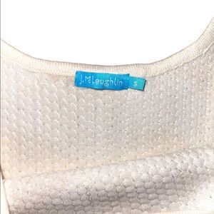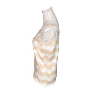 J. McLaughlin Tan Ivory Striped Stretch Georgica Sequin Top. Features horizontal curved stripes in a light creamy tan and white embellished all over with clear sequins. Stretch cotton/modal/spandex blend. Dry clean only.