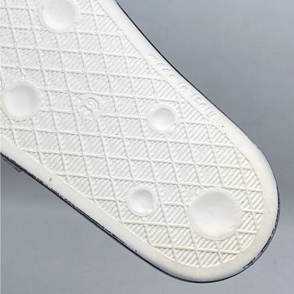 On-trend slides in a vintage-style newspaper print topped with chain hardware.