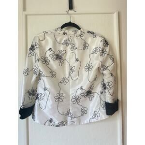 Elegant and striking, this vintage J.R. Nites by Caliendo evening jacket is a beautiful statement piece. Featuring a luxurious satin-like finish, black floral embroidery throughout, and black contrast cuffs, it’s a perfect topper for eveningwear or a bold daytime look. Fully lined and made in the USA, this vintage size 10 jacket gives off timeless glamour with a modern edge.