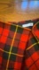 Bold red plaid skirt with asymmetrical cut. Features fringe detailing. Adds a stylish flair.