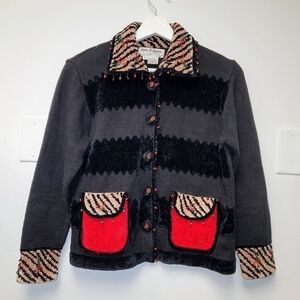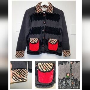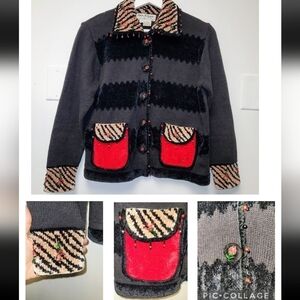 Vintage Jack B. Quick PM Chenille Embellished Beaded Animal Print Cardigan Christmas Sweater Size S