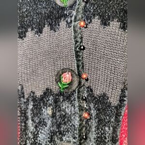 This sweater has hideaway buttons as well as ornamental buttons down the front with lovely beadwork making red flowers. The two sides meet in the middle with red and black beads. The beaded flowers are also sewn into the tiger stripes.