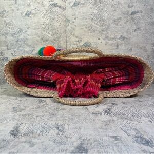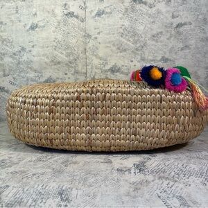 Handwoven hyacinth beach basket with handwoven textile drawstring lining and tassel pom pom charm.