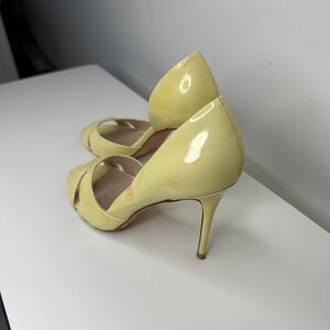 Add a pop of color to your wardrobe with these Jean-Michel Cazabat yellow Olina peep toe patent leather stiletto heels.