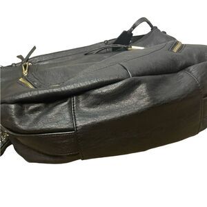 This sophisticated shoulder bag by Jessica Simpson showcases a sleek black leather-like finish, enhanced by striking gold accents. Its rounded design and smooth texture make it a versatile accessory for any occasion, blending style with practicality.