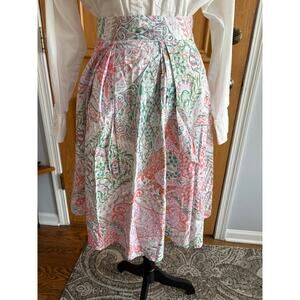 Beautiful and unique Jeune Otte midi skirt, crafted from 100% organic cotton and proudly Made in USA. Features a vibrant multicolor floral and paisley-inspired print with pink, green, and gold tones. The skirt has a structured high waistband with pleating for a flattering silhouette and full shape.