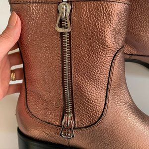 Heel measures approximately 40mm/ 1.5 inches. Metallic distressed-leather. Back tab, silver designer plaque, round toe. Oversized silver zip fastening at side. Color: Rosewood