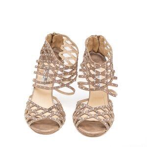 Step into elegance with these stunning Jimmy Choo cage-style sandals, crafted in shimmering taupe suede and adorned with sparkling crystal embellishments throughout. Featuring an intricate lattice cut-out design, open toe, and high stiletto heel, these heels make the perfect statement for any formal occasion.