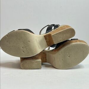 Elevate your style with Jimmy Choo's Black and Cream Platform Shoes, featuring a chic cork-style block heel and secure ankle strap. These platforms offer a sophisticated blend of classic black leather straps and a natural cork texture, making them perfect for any occasion. Experience unparalleled comfort and elegance with their versatile design.