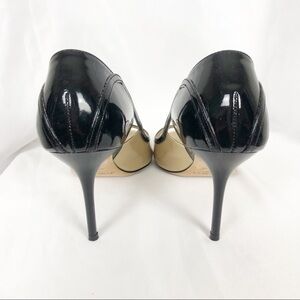 Cutout details, cream tan and black, open round toe, stiletto heel, shiny patent leather. Leather sole and lining. Dressy, work, professional, neutral, cocktail, formal, evening.