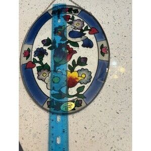 Add a touch of charm to any room with this beautiful Joan Baker vintage suncatcher window. The oval shape features a colorful design of birds and flowers, made from etched glass and finished with a stunning stainless glass effect. Measuring 7 inches in height and 5.25 inches in width, this small suncatcher is perfect for any space.