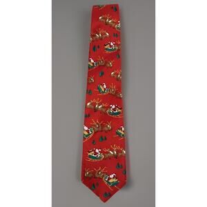 John Henry Men’s Silk Christmas Tie Red Santa Sleigh Reindeer Trees Holiday